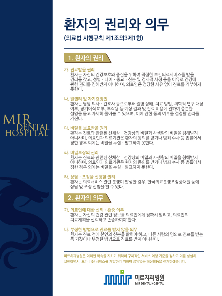 미르치과병원은 “모든이의 가치창조, 최상의 의료서비스 제공, 학문적, 임상적 선도적 역할”이라는