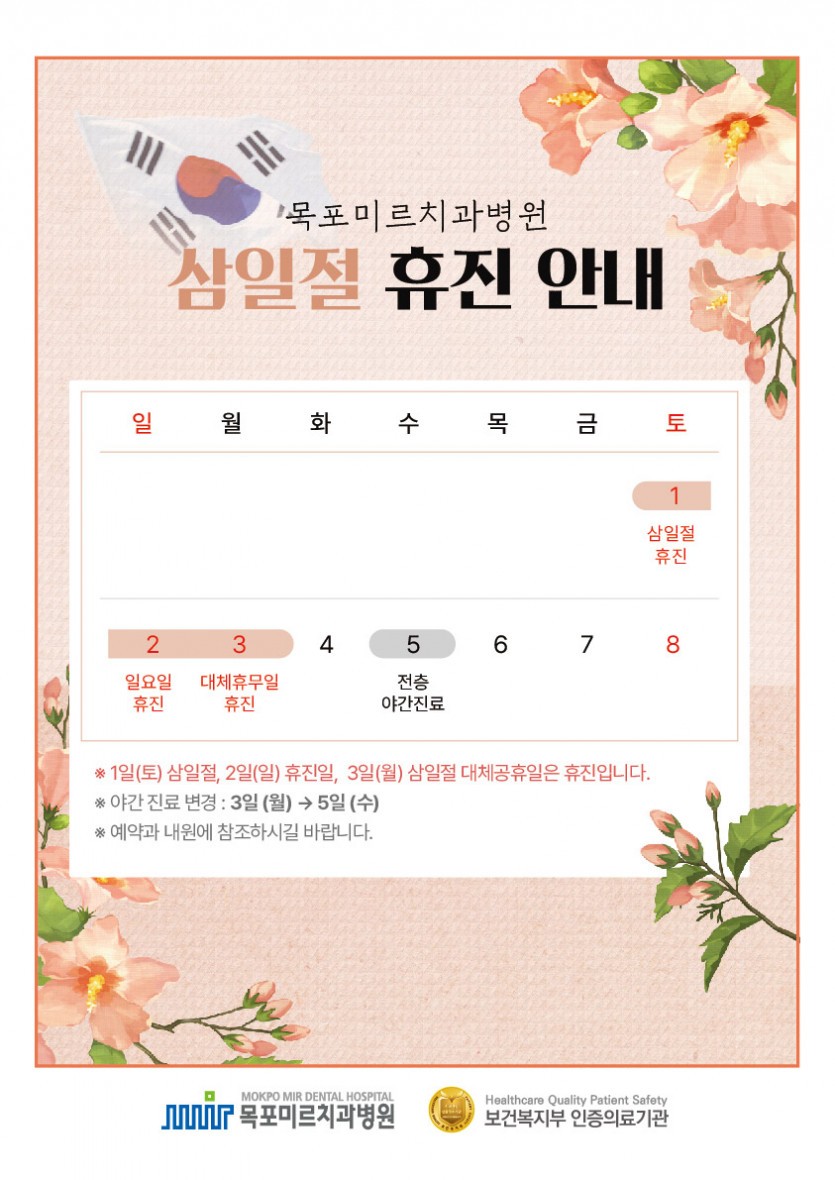 ※ 1일(토) 삼일절, 2일(일) 휴진일,
